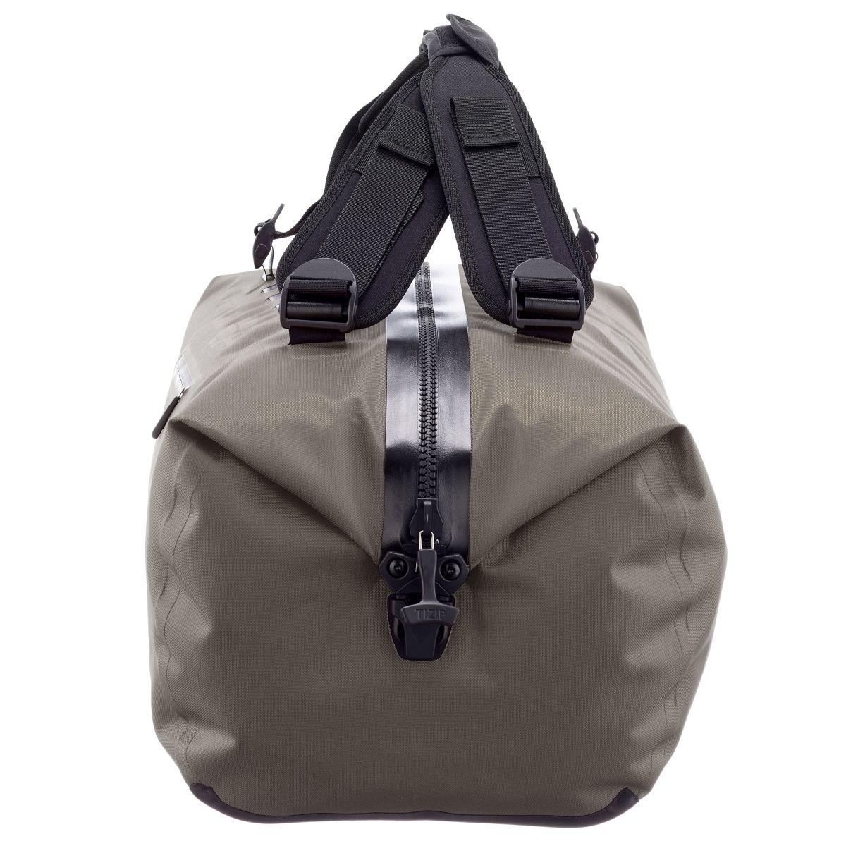 Wasserdichte Duffle für Reise und Alltag; leichtes PU-Gewebe; TIZIP-Reißverschluss, absperrbar und mit Steckverschlüssen an den Enden; 1 Reißverschlußinnentasche mit Unterteilung und Einklemmschutzfunktion; 1 Reißverschlussaußen-