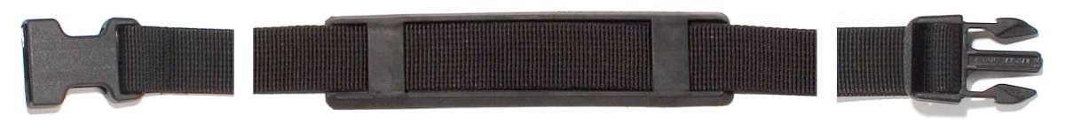 Universeller Tragegurt für Back-Roller und Sport-Roller, mit Schulterpatte aus Kunststoff sowie Stecker und Gehäuse an den Enden.