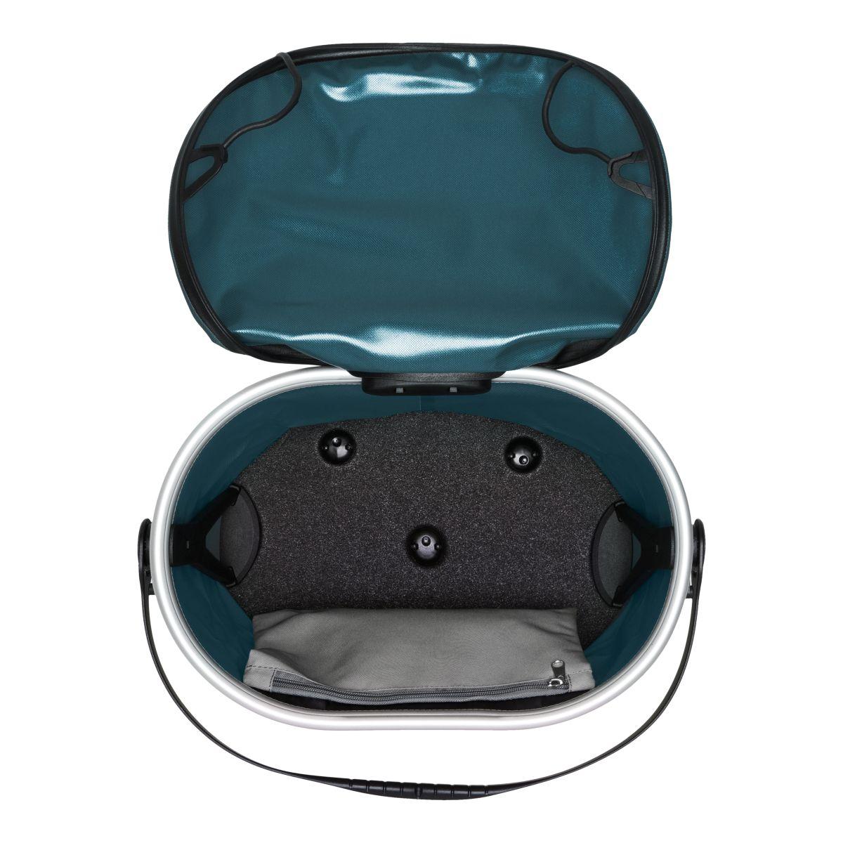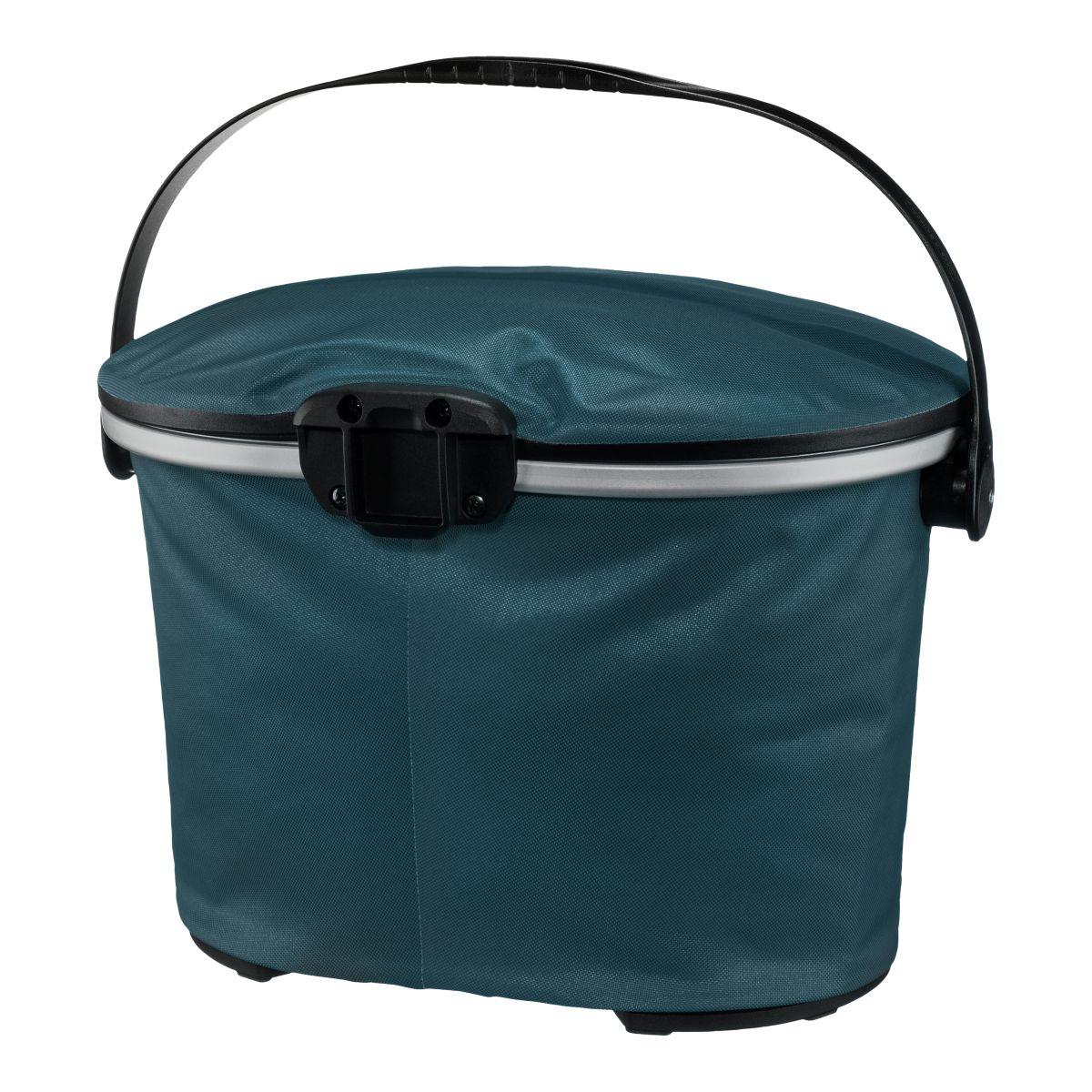 Wasserdichter Fahrrad-Lenkerkorb mit Deckelverschluss; mittige Deckelfixierung erlaubt schnellen Zugriff auf Inhalt; stabiler Aluminiumrahmen; komfortabler, verstellbarer Tragegriff; PU-beschichtetes Gewebe; Innentasche mit Reißverschluss; Korb steht selbstständig durch Innenversteifung; stabile Abstellfüße; Reflektor; maximale Zuladung 5 kg.