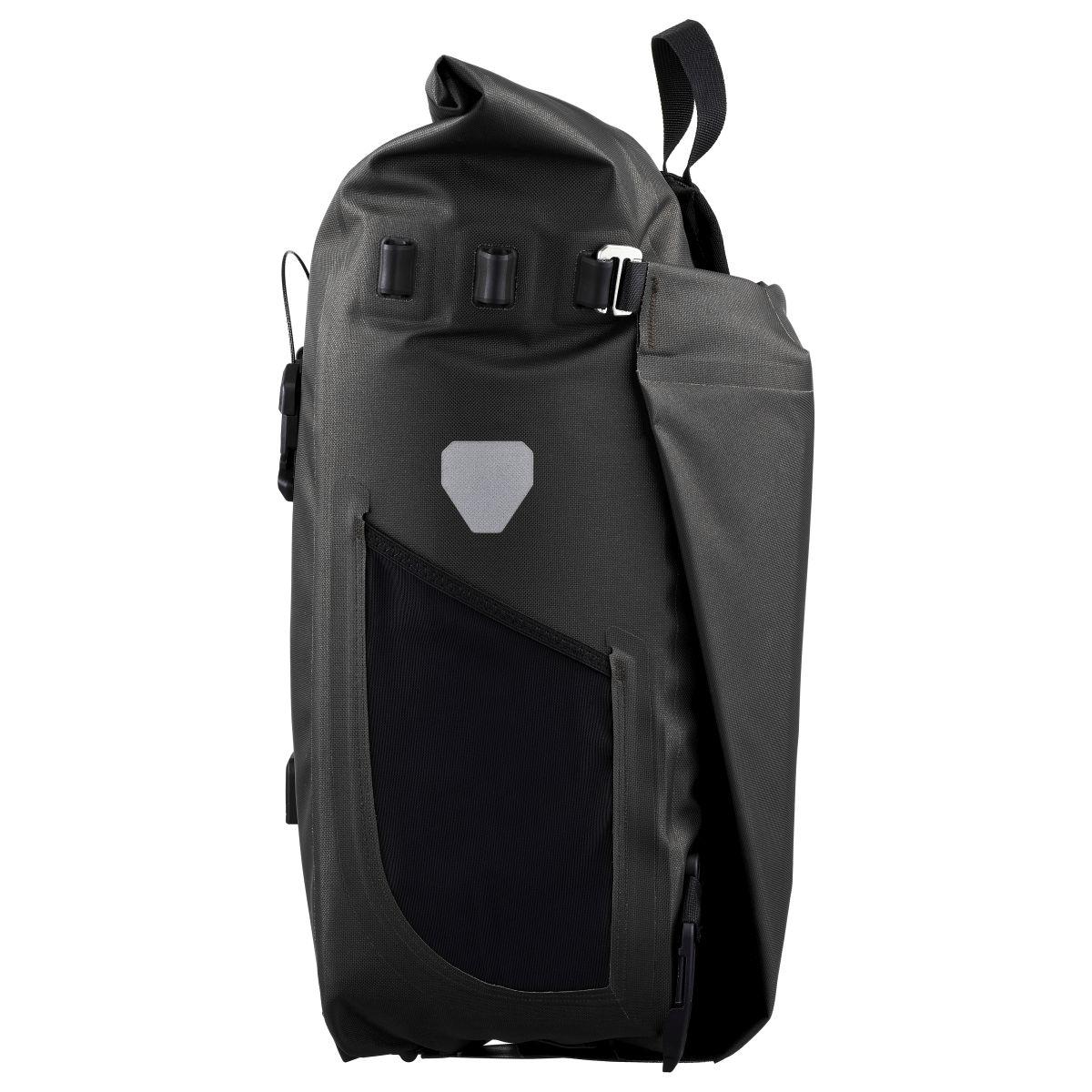 Rucksack mit Rollverschluss und Quick-Lock Aufhängesystem, Einsatz als Radtasche oder Rucksack, schneller, intuitiver Wechsel zwischen den Funktionen mittels wendbarer Fronttasche, Außentasche in Flap integriert (nicht wasserdicht!), seitliche Netzaußentasche, Innentasche mit Laptopfach, Tragegriff, Brustgurt, Reflektoren.