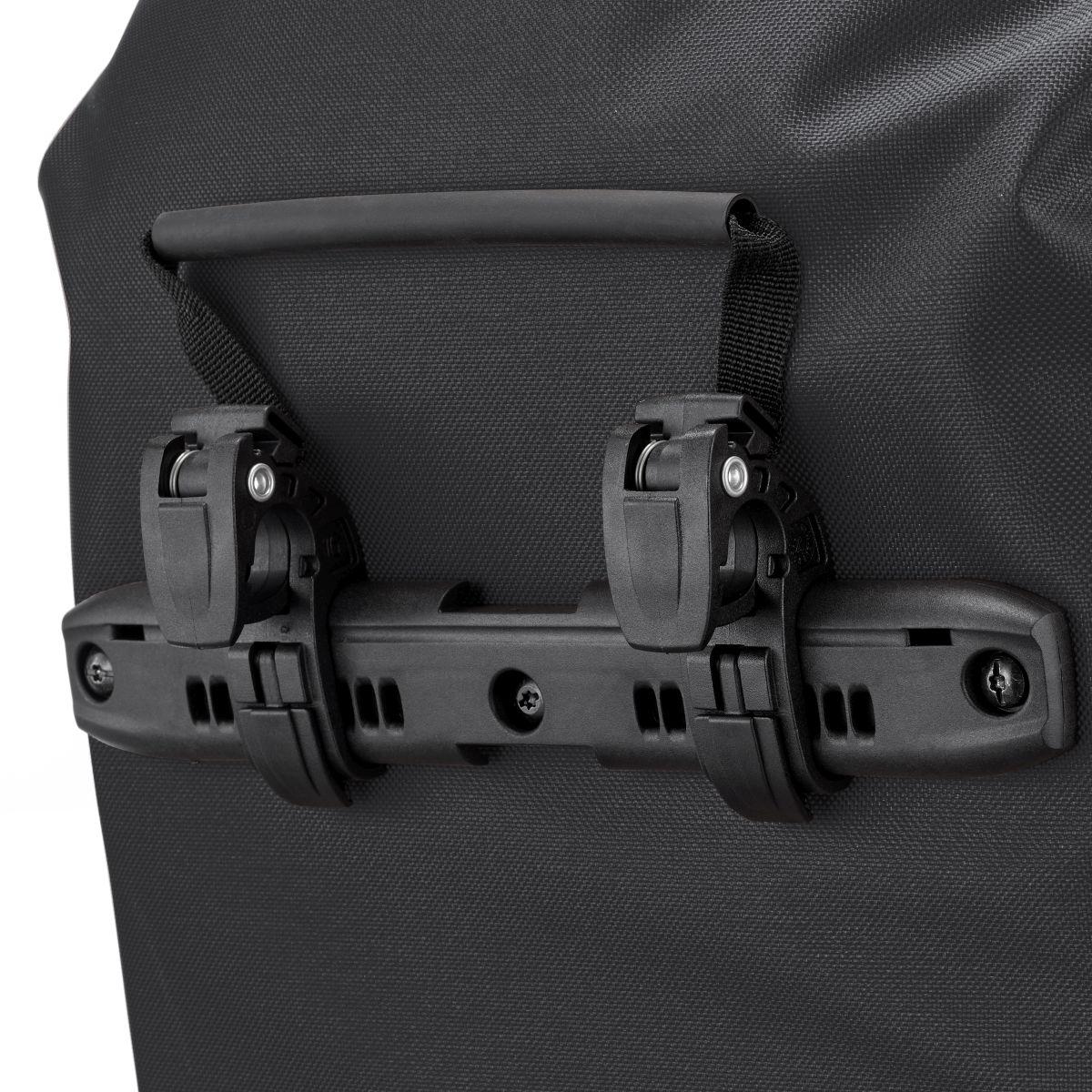 Rucksack mit Rollverschluss und Quick-Lock Aufhängesystem; Einsatz als Rucksack oder Radtasche; schneller, intuitiver Wechsel zwischen den Funktionen mittels elastischer, wendbarer Fronttasche; Außentasche in Flap integriert (nicht wasserdicht!) und in beiden Modi zugänglich; Innentasche mit Laptopfach; Tragegriff. Quick-Lock2.1 System bis 16 mm Gepäckträgerrohr.